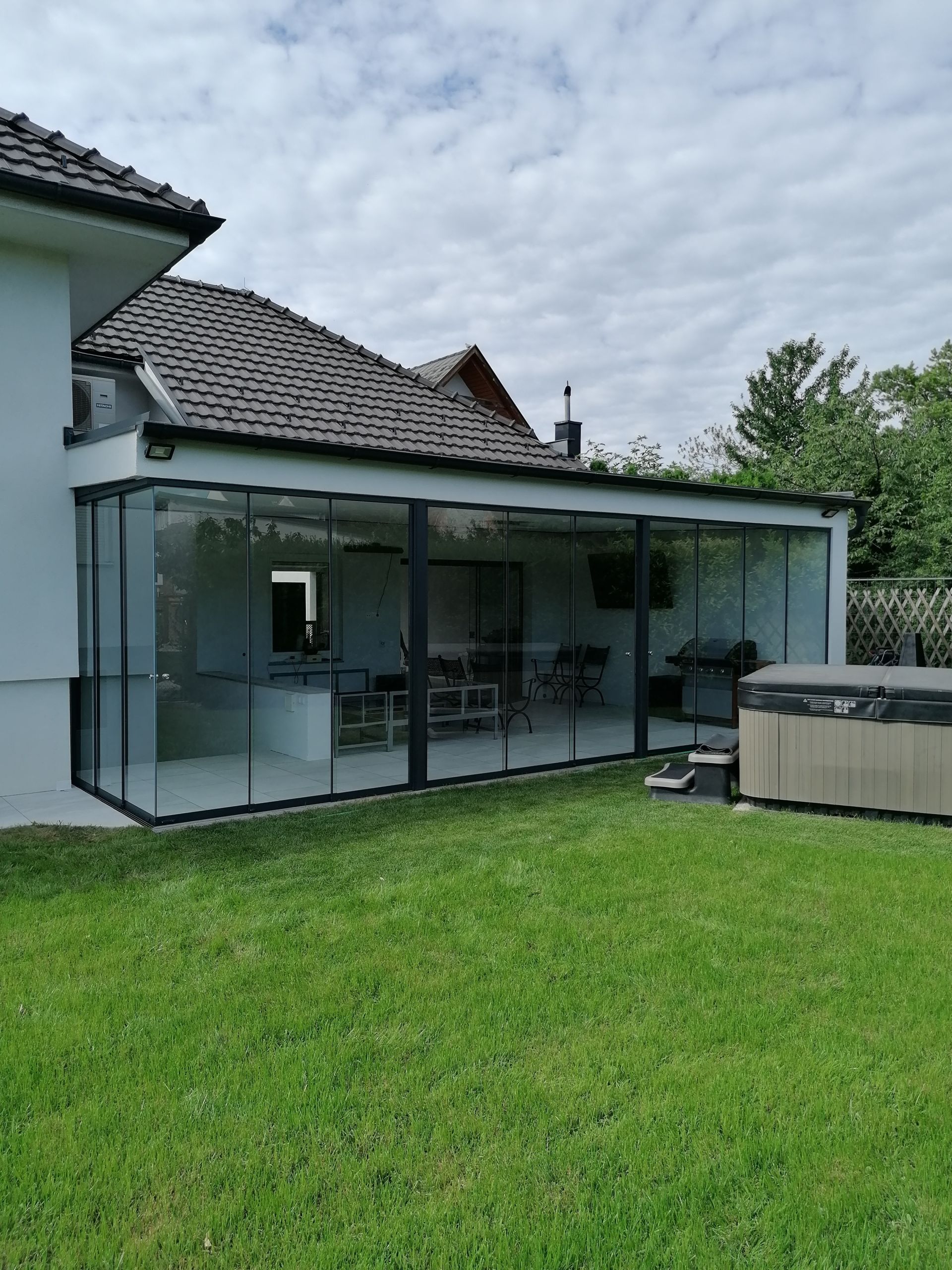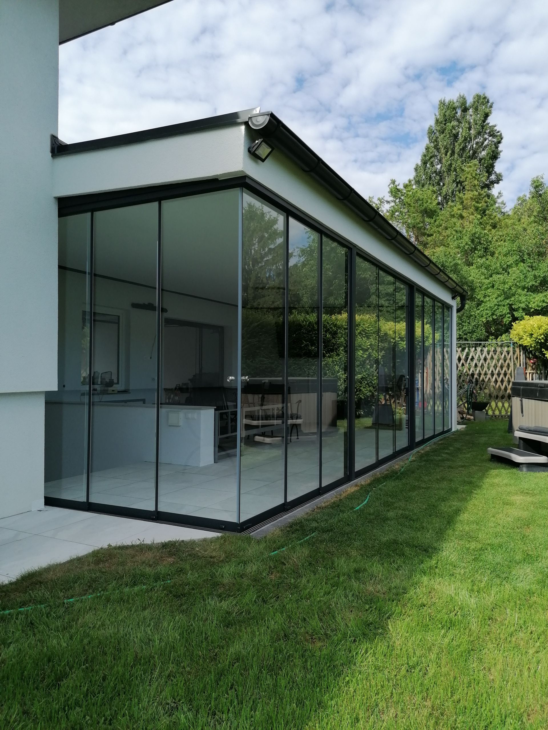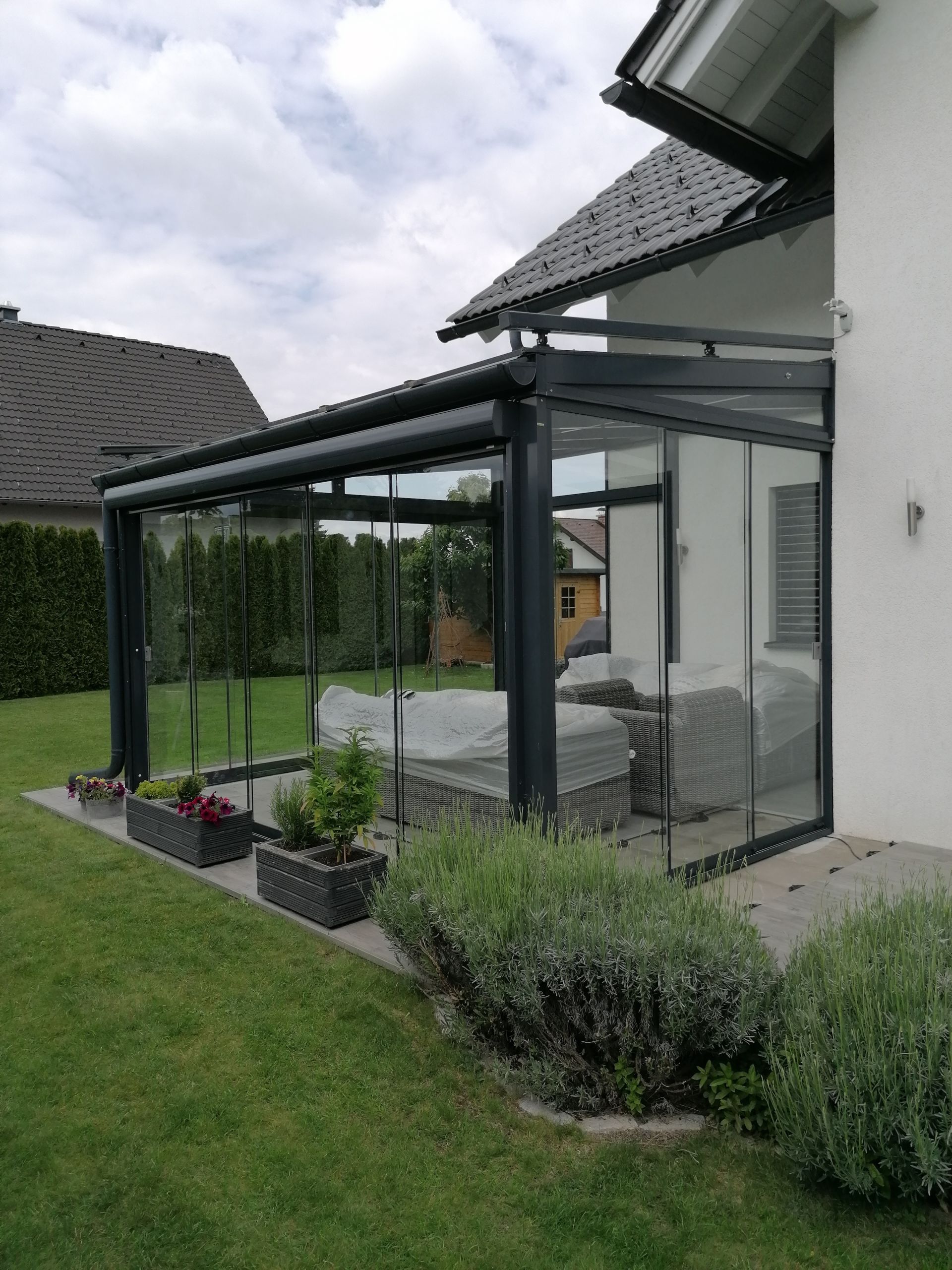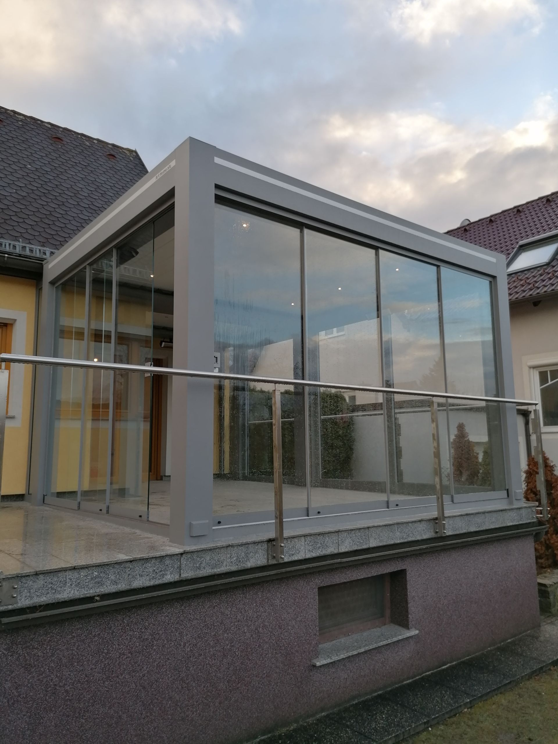 - Seitliche Verglasung: nach Wunsch mit hauseigenen feststehenden sowie Schiebe- oder Öffnungselementen, mit verschiedenen Glasvarianten (Float-, Sicherheits- und Wärmeschutzglas, ein- oder mehrschichtig) – von hoher Lichtdurchlässigkeit bis hin zu vollständigem Sichtschutz.